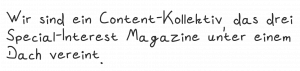 Was alle unsere Magazine verbindet: Wir glauben an Content, der mehr ist als schnelle Information. Unsere Geschichten regen zum Nachdenken an, bieten neue Perspektiven und schaffen echte Verbindungen. Wir schreiben über Alltägliches und Hobbys, über Träume und Leidenschaften – immer mit dem Anspruch, dass unsere Inhalte nachklingen